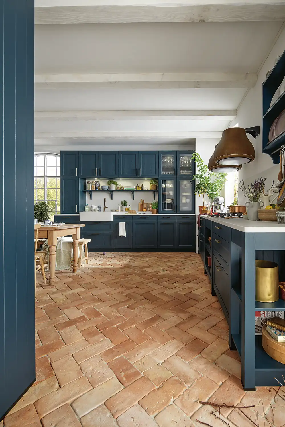 La cuisine Finca de Schüller évoque une promenade en Méditerranée, où nature et espace s’unissent pour offrir une expérience culinaire apaisante. Ses façades en laque satinée bleu foncé, avec portes aux poignées en laiton, apportent un confort intemporel. Le plan de travail en Quartz Systemo et les sur-meubles vitrés ajoutent une touche élégante. Les détails en chêne naturel, comme les inserts, les compartiments de rangement modulables et les étagères ouvertes, créent une atmosphère lumineuse et chaleureuse, parfaite pour un style country moderne.