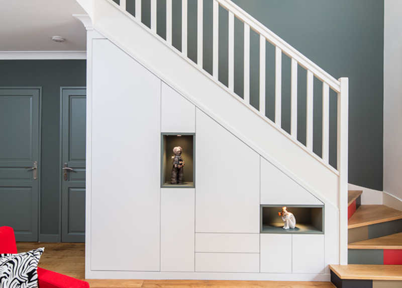Cet aménagement sous-escalier se compose de coffres coulissants avec poignées. L’ensemble est surmonté par une immense bibliothèque.