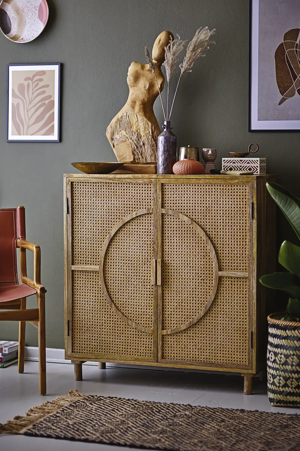 L’armoire Pablo de Bloomingville allie le bois de manguier massif à un élégant rotin, créant ainsi un design raffiné. Son motif unique sur les portes confère à l’armoire un caractère distinct, la transformant en un véritable élément décoratif dans n’importe quelle pièce. À l’intérieur, elle offre une étagère spacieuse, idéale pour le rangement, tout en se fermant en toute sécurité grâce à des aimants. Parfaite pour mettre en valeur des vases et d’autres objets décoratifs
