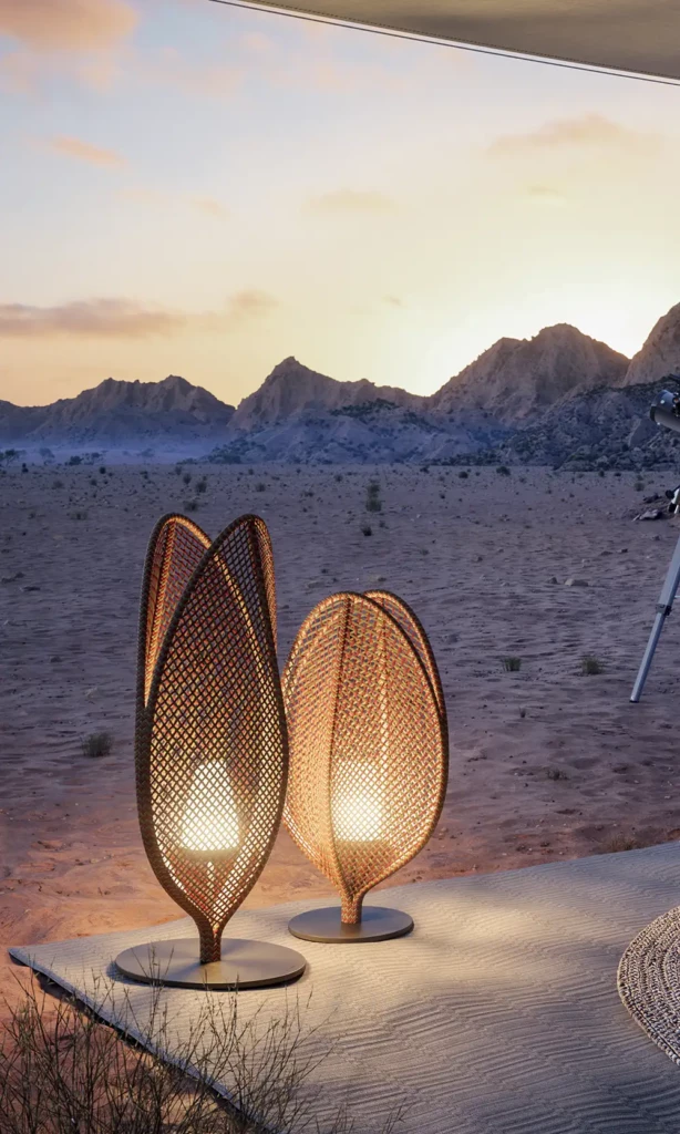 Oasi… animaux fantastiques transformés en objets lumineux créés pour évoluer à la belle étoile. Oasi est livré avec une base en acier inoxydable, fini avec une peinture finement structurée et du verre italien soufflé bouche. La combinaison de couleurs est inspirée par la terre, comme Ourika, nom de la vallée rouge dans le sud de Marrakech.