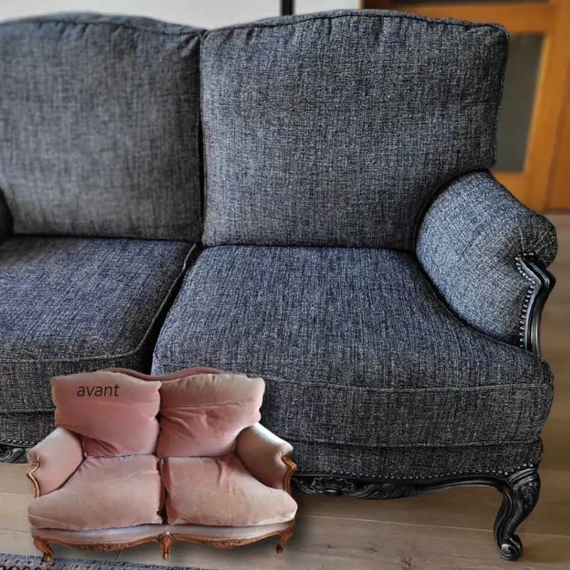 Chez Meubles Le Du Ambiance Tiffany les concepteurs/agenceurs sont à votre service pour repenser votre intérieur. Du sol au plafond, ils vont concevoir avec vous toute votre nouvelle déco. Cela implique bien évidemment le relooking du mobilier dont vous ne voulez pas vous séparer. Ce joli canapé 2 places quelque peu défraîchi a repris vie grâce au travail de Gilles Cluzeau, tapissier professionnel.